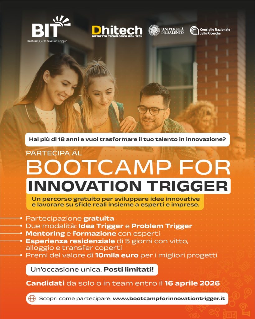 Il BIT – Bootcamp for Innovation Trigger è promosso dalla Fondazione DHITECH – Distretto Tecnologico HIGH-TECH, in collaborazione con Università del Salento e Consiglio Nazionale delle Ricerche (CNR).